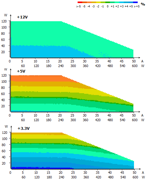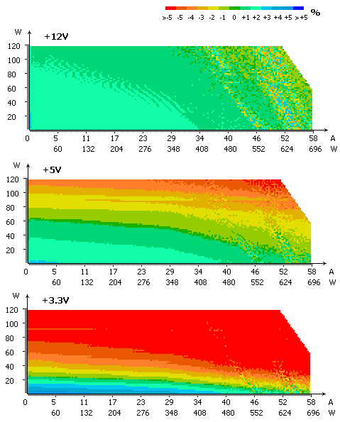 Во-первых, совершенно четко видна неприспособленность каналов +3,3 и +5 к высоким нагрузкам (более 40 Вт и 80 Вт для первого и второго соответственно). Это, конечно, не радует, однако же в реальных условиях вряд ли отбираемая мощность превысит эти значения.