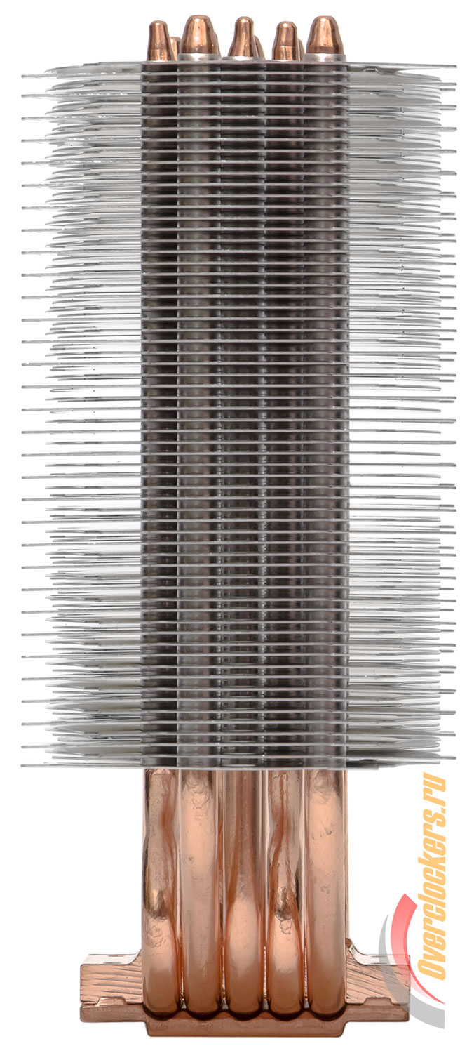 Но уже при внешнем осмотре первого Baram было видно, что «это жжж неспроста». Начнем с того, что тепловые трубки распределены по площади рассеивающих пластин более равномерно, чем у всех односекционных башенных радиаторов, что мне когда-либо встречались. Они образуют два вытянутых креста (при взгляде сверху), причем как раз там, где создаваемый 120-мм вентиляторами воздушный поток будет максимальным.