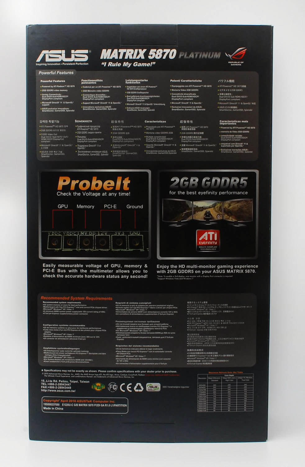 Задняя сторона коробки дает возможность подробнее изучить навороты видеокарты. Самыми важными, если исходить из размера вставок на поверхности коробки, разработчикам представляются две вещи. Во-первых, это возможность мерить напряжение разных компонентов графического ускорителя «на лету» с помощью вольтметра (шесть миниатюрных разъемов под щуп находятся на оборотной стороне видеокарты). Предполагается, что счастливый обладатель «Matrix» будет с энтузиазмом мерить щупом тестера напряжение работающих процессора, памяти или шины PCI-E. Не знаю, как насчет других, а на меня эта возможность впечатления не произвела.