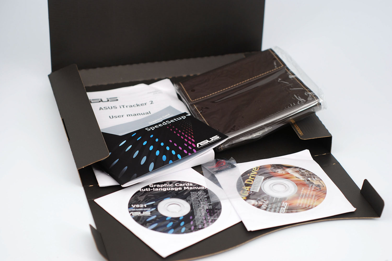 В комплектацию входит: два переходника для блока питания 2x6 – 8 pin, по переходнику DVI-VGA и DVI-HDMI, мостик CrossFire, диск с драйверами. Помимо этого, приложено несколько руководств: по быстрой установке, по использованию фирменной утилиты для разгона iTracker 2 и еще одно на диске в электронном (и даже мультиязычном) виде. И напоследок – кожаный чехол для CD/DVD дисков.