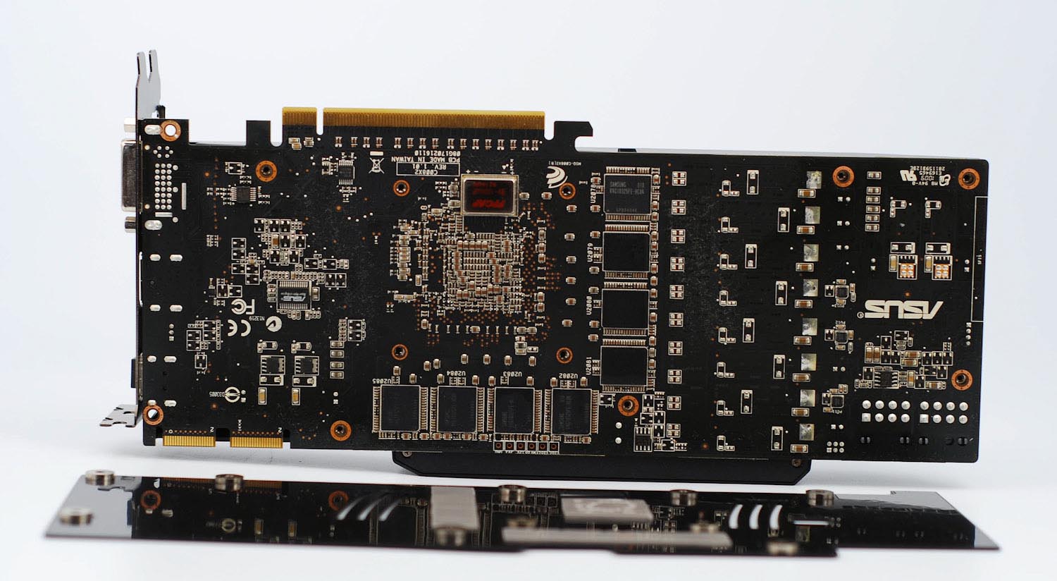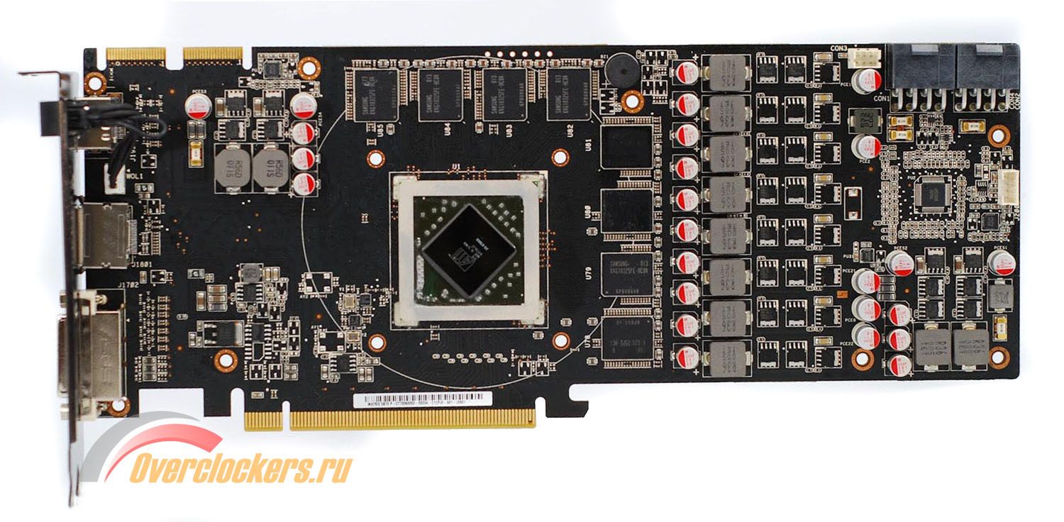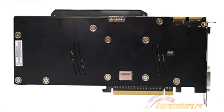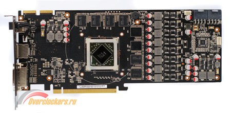Сняв пластину, отмечаем наличие восьми микросхем видеопамяти. Нетрудно догадаться, что с другой стороны мы увидим их близнецов, ведь недаром заявлен общий объем в 2048 Мбайт.