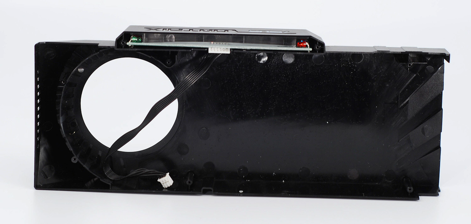 А вот и лицевая сторона видеокарты со снятым кожухом. Один из разъемов дополнительного питания предназначен собственно для питания турбины, а вот второй разъем нужен для питания интеллектуальной подсветки. В зависимости от степени загрузки видеокарты изменяется цвет подсветки надписи «Matrix» на торце. Например, зеленый – это легкая нагрузка, красный – экстремальная нагрузка, ну и пара промежуточных вариантов.
