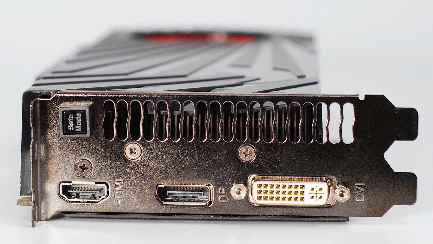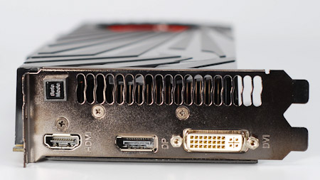 Набор разъемов для подключения к монитору: DVI, DisplayPort, HDMI. Кроме того, присутствует кнопка Safe Mode, которую следует нажимать в случае необходимости возврата работы видеокарты в штатный режим. Например, если после разгона Matrix Platinum Edition не справится с высокопроизводительным приложением и зависнет.
