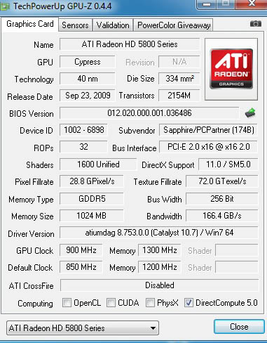 Приведем скриншоты характеристик двух оставшихся карт в состоянии разгона. Первая: Sapphire Radeon HD 5870 1024 Мбайт.