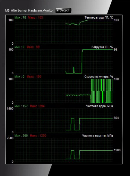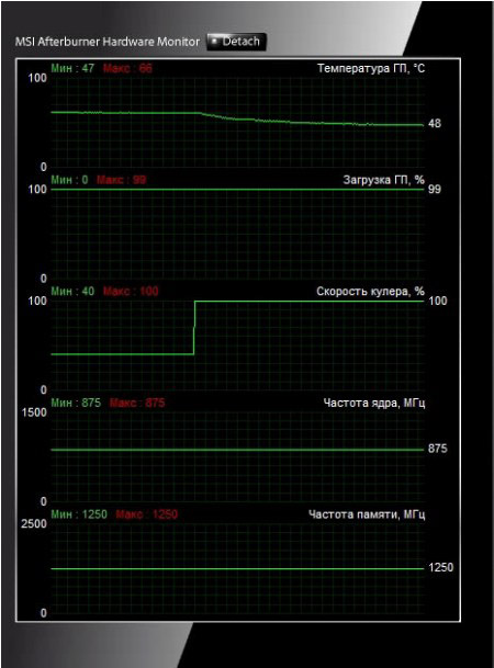 Как уже упоминалось, при тестировании ASUS Radeon HD 5870 Matrix Platinum Edition начала аварийно завершать работу из-за перегрева. В первый раз это произошло во время прогона бенчмарка S.T.A.L.K.E.R.: Clear Sky, а во второй раз было вызвано искусственно путем запуска FurMark. MSI AfterBurner показала следующую любопытную картину: