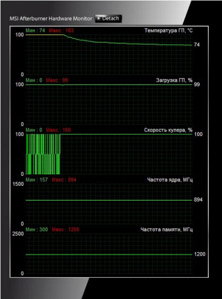 Как видно, после возникновения мигающего режима работы вентилятора была установлена вручную постоянная мощность оборотов на 100%. В результате через примерно семь минут температура графического процессора упала до 74 градусов, и упала бы еще больше, если бы я не прекратил опыт.