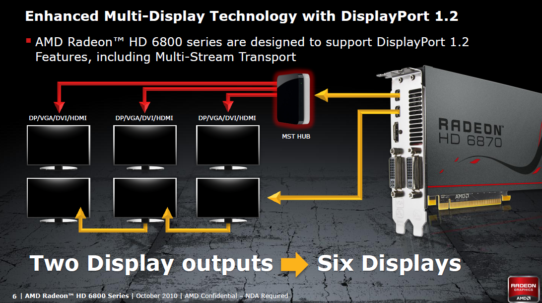 Основное отличие заключается в том, что теперь, используя специальный хаб, к одному порту mini Display Port можно подключить одновременно три монитора для последующего объединения с помощью технологии AMD Eyefinity, которая, к слову, никуда не делась.