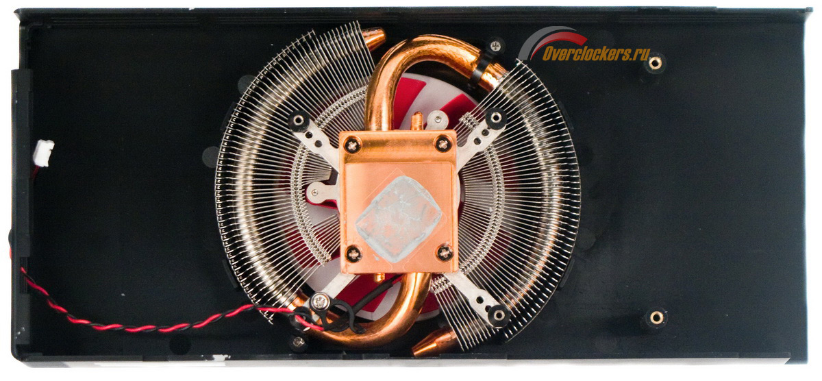 После отделения котлет от мух, а кулера от кожуха у нас остается радиатор с двумя медными теплотрубками, проходящими через все ребра. Мы хорошо знакомы с подобными системами охлаждения, обычно они бывают тихими и эффективными. Как она покажет себя в деле, выяснится чуть позже. Проблема данного типа систем охлаждения заключается в том, что они рассчитаны только на отвод тепла от самого GPU, а вот микросхемы памяти и прочие элементы печатной платы остаются без охлаждения. Обычно, производители учитывают это и "вешают" дополнительные радиаторы.