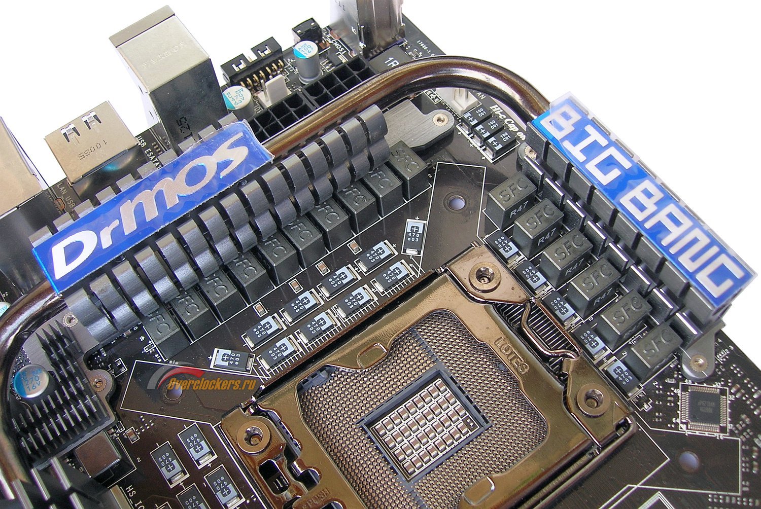 Вместо традиционных связок из мосфетов и драйверов используется технология DrMOS. В системе питания процессора (Vcore и CPU_VTT) установлены микросхемы Fairchild FDMF6704V, а в системе питания памяти и северного моста – Renesas R2J20651NP: