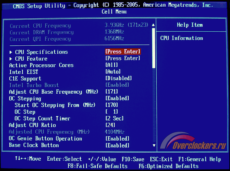 Все настройки для разгона находятся в одном большом разделе Cell Menu, которое занимает три экрана. На первом экране собраны настройки для выбора количества активных ядер процессора и для управления технологиями Intel EIST, C1E, Intel Turbo Boost. Вдобавок здесь можно изменить частоту BCLK (в интервале от 100 до 600 с шагом 1 МГц), множитель процессора, настроить технологию полуавтоматического разгона OC Stepping (повышает только BLCK) и технологию полностью автоматического разгона OC Genie.