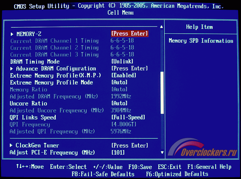 На втором экране Cell Menu собраны настройки памяти, контроллера памяти и шины QPI. Частоту и тайминги памяти можно задать вручную или на основе профиля XMP. Здесь же можно выбрать множители для памяти, Uncore и шины QPI.