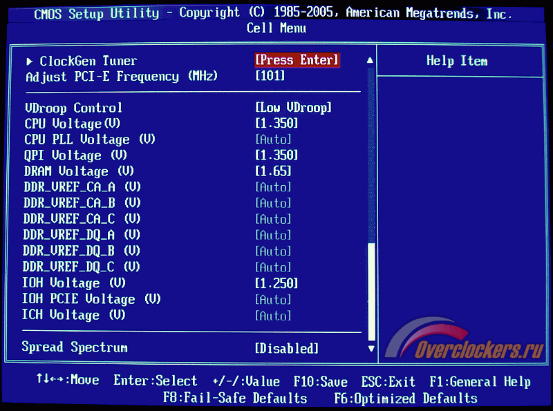На втором экране Cell Menu можно задать частоту шины PCI-E (от 100 до 190 с шагом 1 МГц), настроить VDroop (управление напряжением Vcore под нагрузкой) и различные напряжения, а также отключить опцию Spread Spectrum.