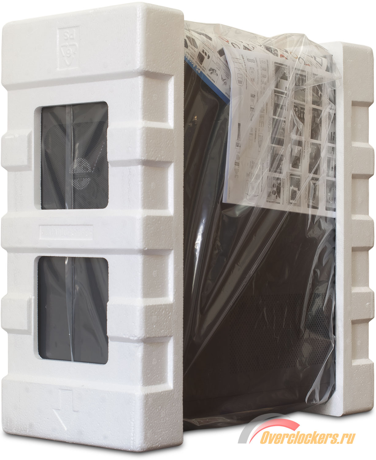 Внутри корпус стандартно обернут в полиэтилен и зажат между двумя пенопластовыми демпферами-фиксаторами.