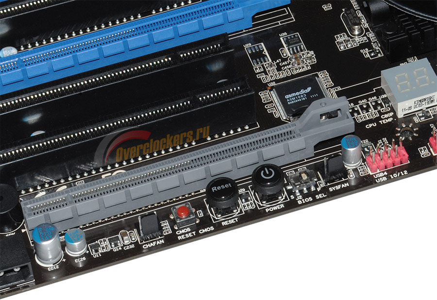 Необходимо отметить неудачную компоновку разъемов. Слоты синего цвета, которые можно использовать для создания CrossFire-связки, расположены через один. При установке в систему видеокарт с «двухслотовой» системой охлаждения (а большинство мало-мальски серьезных видеоускорителей сегодня оснащаются СО именно такого формата) «верхней» плате будет попросту нечем дышать. Ведущие производители все чаще применяют схему с распайкой разъемов PCIe «через два» как раз для того, чтобы обойти эту проблему.