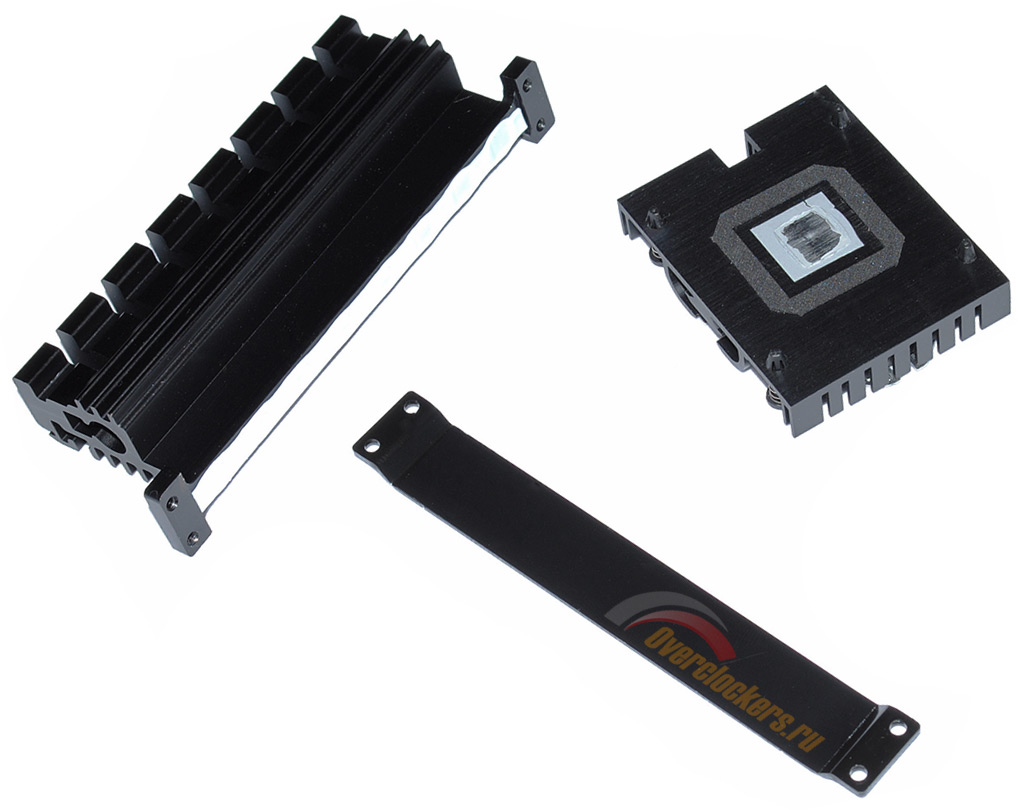 Крепление радиатора VRM осуществляется посредством четырех небольших винтиков, для увеличения прочности всей конструкции применяется дополнительная стальная планка на обратной стороне текстолита (своеобразный «бэкплейт»), контакт основания и MOSFET’ов происходит через термопрокладку белого цвета. Меньший радиатор крепится пластиковыми защелками, в этом случае для обеспечения контакта используется термопаста.