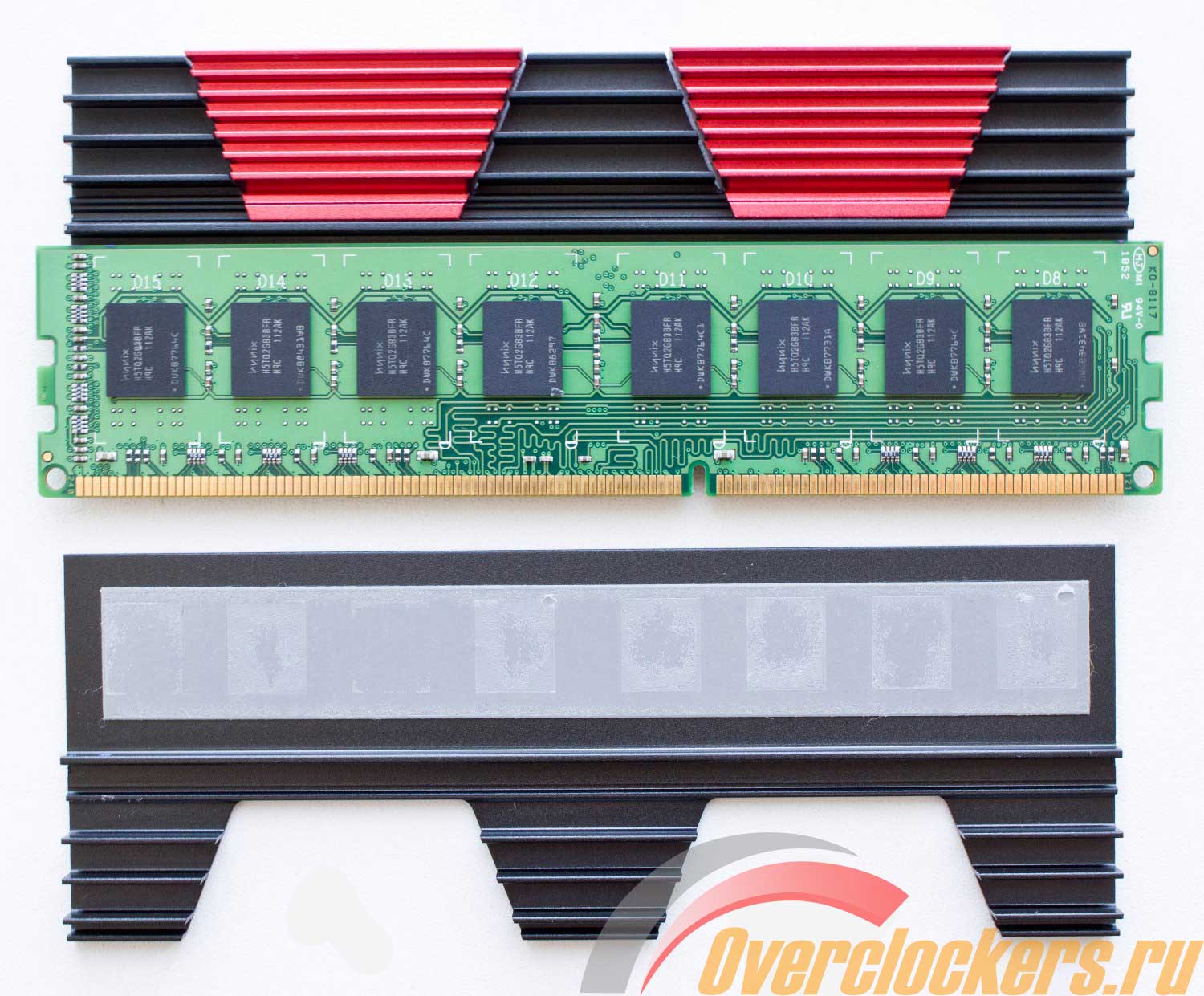 Снять радиатор удалось без особых трудностей. Немного нагрев его феном, с помощью отвертки радиатор без проблем отошел от микросхем памяти. Между радиатором и микросхемами памяти производитель уложил клейкую термопрокладку.