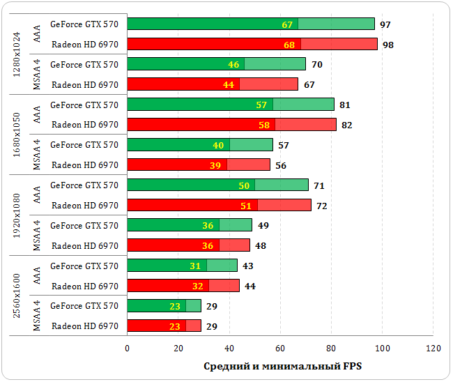 Для более наглядного сравнения видеокарт и процессоров игра, используемая в качестве тестового приложения, запускалась в разрешениях 1280х1024, 1680x1050, 1920х1080 и 2560х1600.