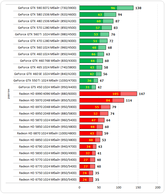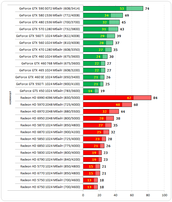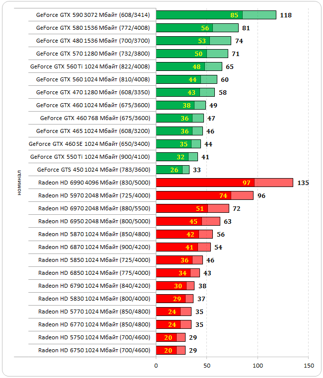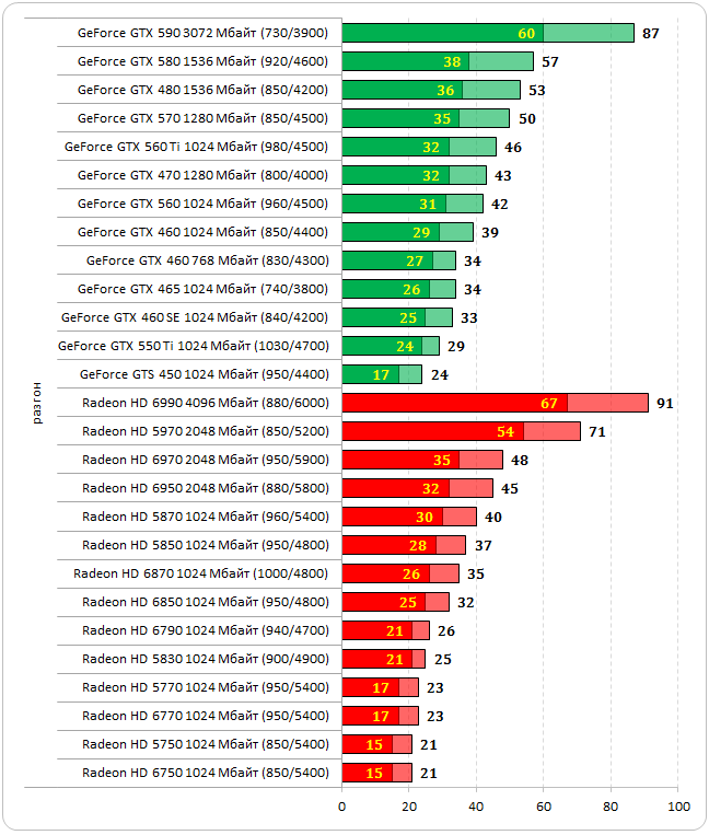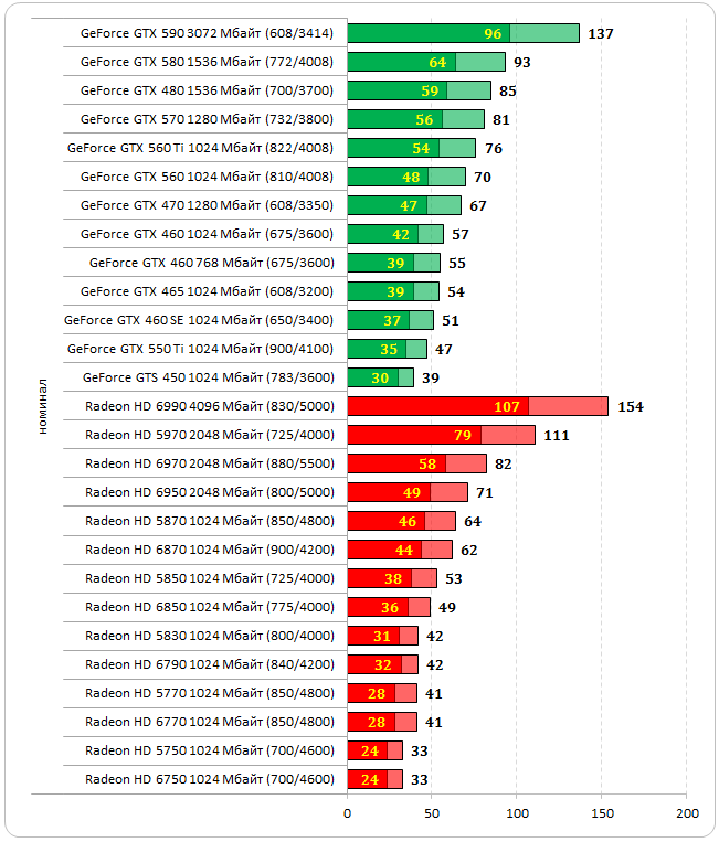 Сводные диаграммы результатов тестов одиночных видеокарт
