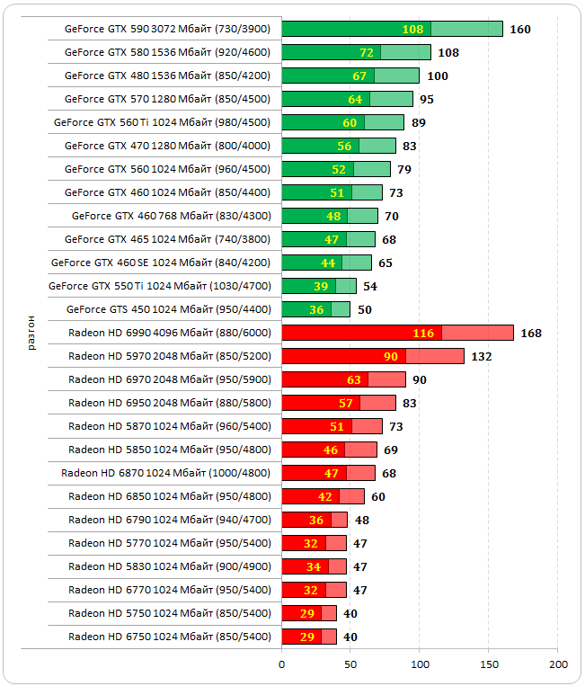 - GeForce GTX 590 3072 Mбайт - 608/1215/3414 @ 730/1460/3900 МГц (MSI)