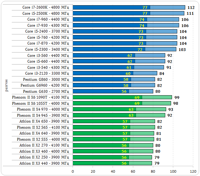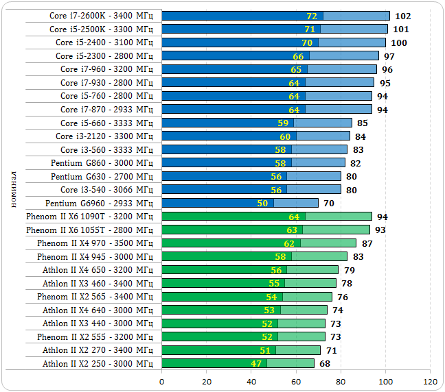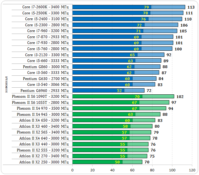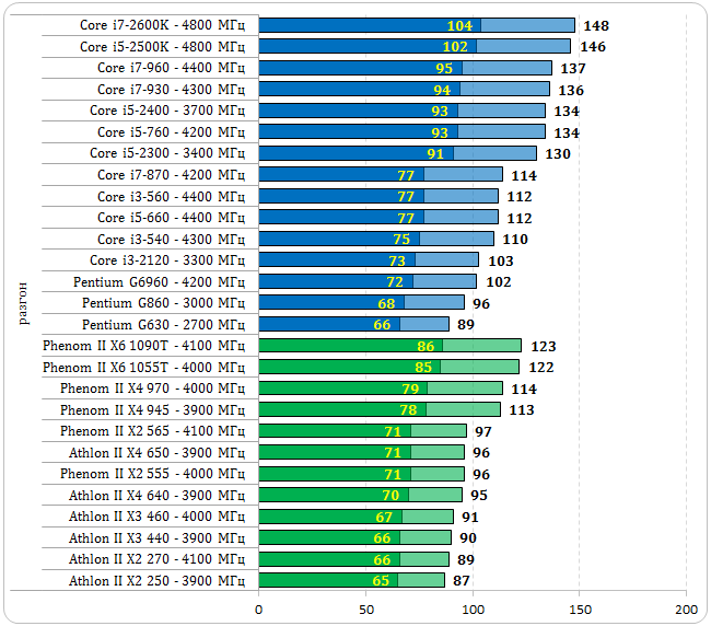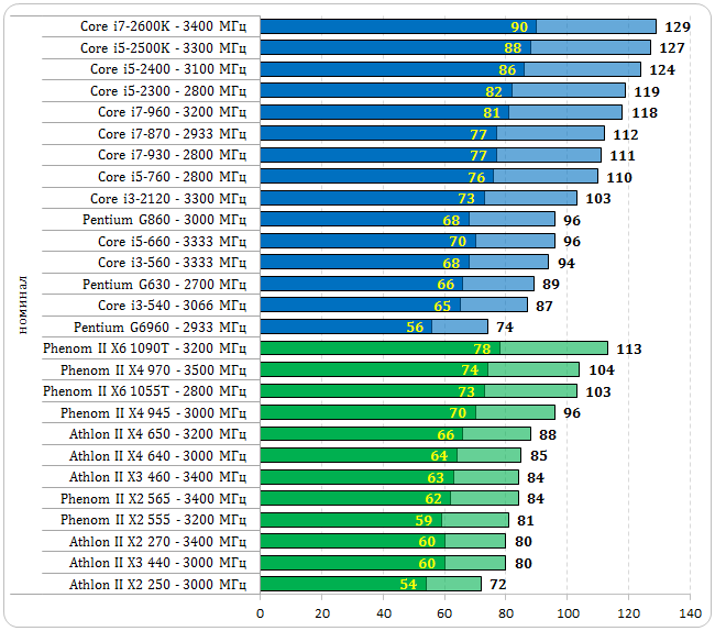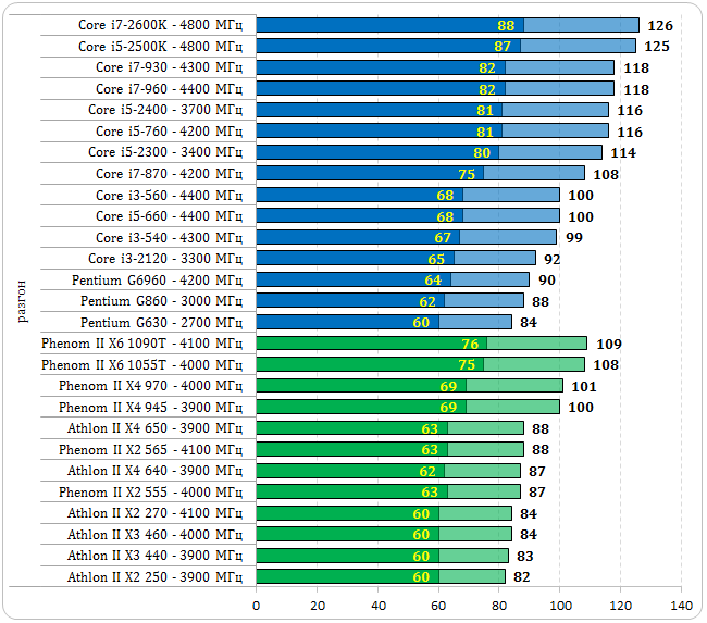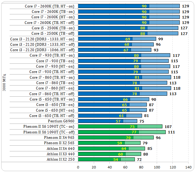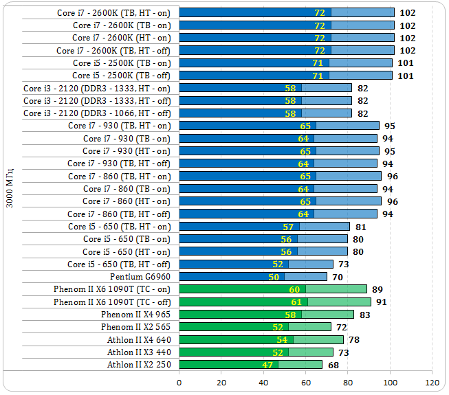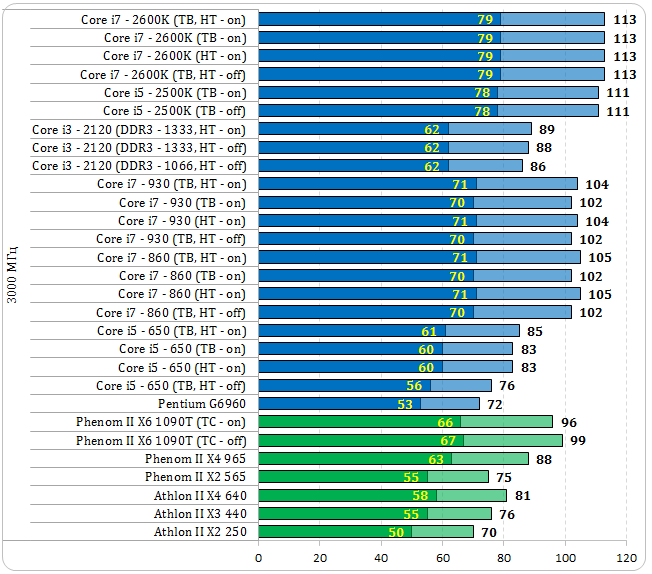 Сводная диаграмма результатов тестов процессоров, работающих на частоте 3000 МГц