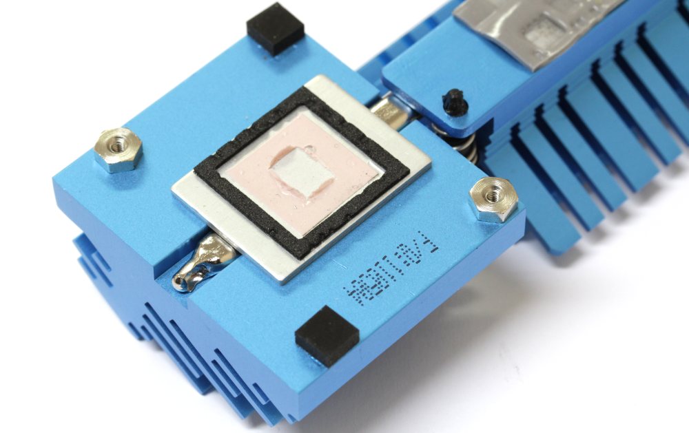 Его габариты и площадь оребрения невелики, они вполне соответствуют небольшому количеству выделяемого тепла. В качестве термоинтерфейса снова применена розовая «терможвачка».