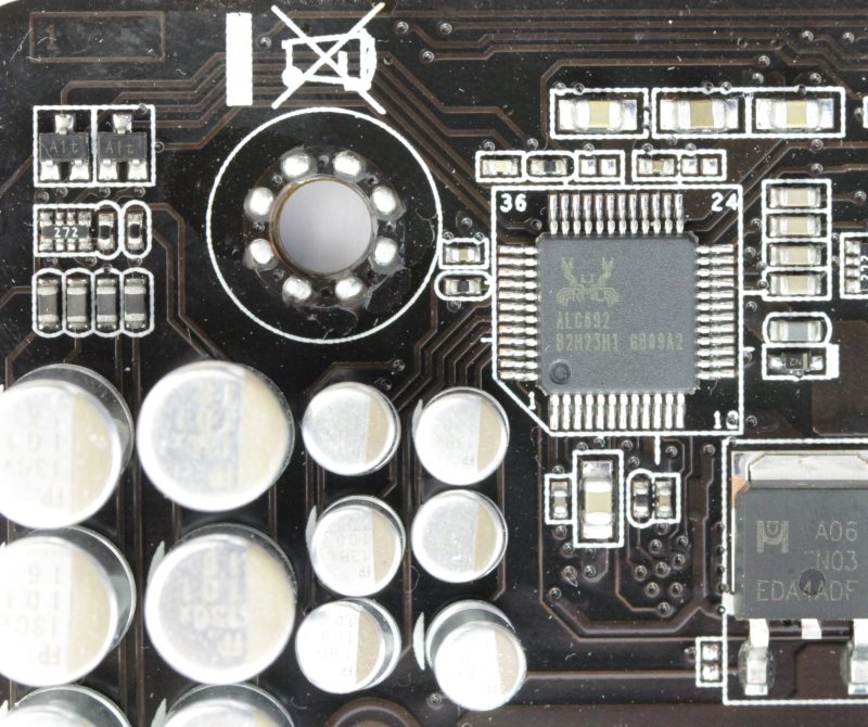 Один из них можно найти на задней панели, а другой в виде колодки размещён по нижнему краю платы. Неподалёку от него, расположились разъёмы передней аудиопанели и SPDIF Out, а в левом нижнем углу можно обнаружить «чип» восьмиканального звукового кодека Realtek ALC892.