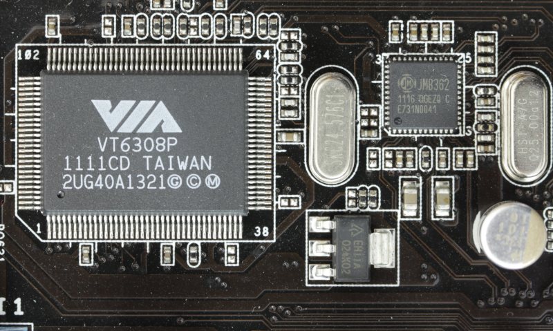 Немного выше его расположена уже упомянутая микросхема VIA VT6308P, рядом с ней распаян ещё один контроллер JMicron JMB 362.