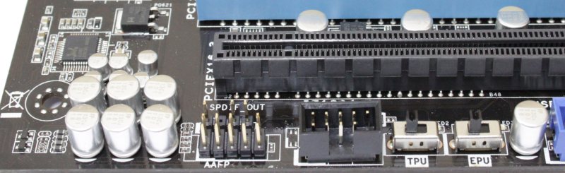 Вдобавок на плате есть два переключателя – EPU и TPU, которые включают/выключают одноимённые функции. Расположены они внизу платы между колодками USB и IEEE1394.