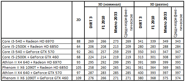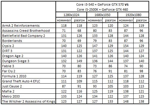 Сводная таблица производительности Core i3-540 + GeForce GTX 570 и Core i5-2500K + GeForce GTX 460, где за 100% взят результат Core i5-2500K + GeForce GTX 460