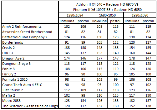 В разрешении 1920x1080 Athlon II X4 640 + Radeon HD 6970: