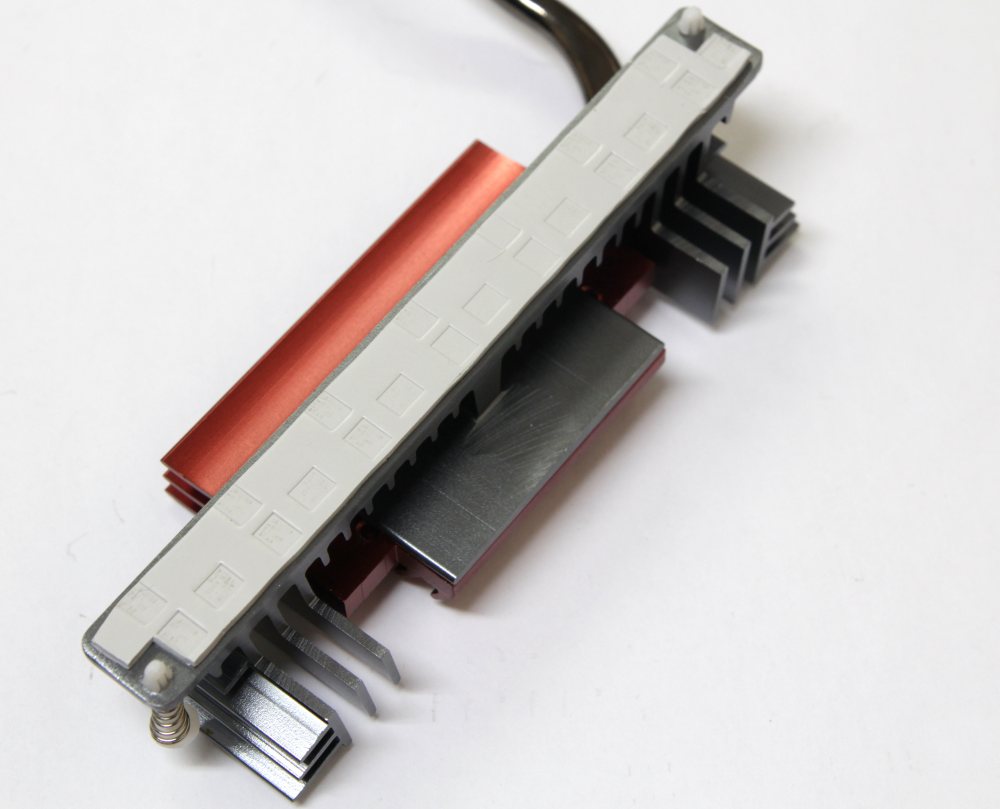 Мосфетный радиатор выполнен из двух частей и образует сложную форму. В качестве термоинтерфейса используется прокладка толщиной около 1 мм. Крепление осуществляется двумя пластиковыми клипсами с пружинками.