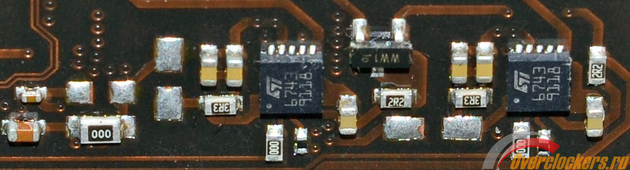 С обратной стороны материнской платы можно обнаружить две микросхемы-драйвера STMicroelectronics L6743: