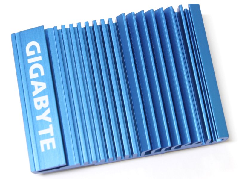 Он изготовлен из алюминиевого сплава и окрашен в голубой цвет. Сверху в нижней части есть белая надпись с названием фирмы-производителя. Чипсетный радиатор занимает внушительную площадь, хотя сама площадка теплоотвода не очень большая. По ее периметру есть защитная рамка из черного пористого материала, для предотвращения перекосов при монтаже. В качестве термоинтерфейса используется розовая «терможвачка». Крепление производится при помощи двух подпружиненных винтов с обратной стороны платы.