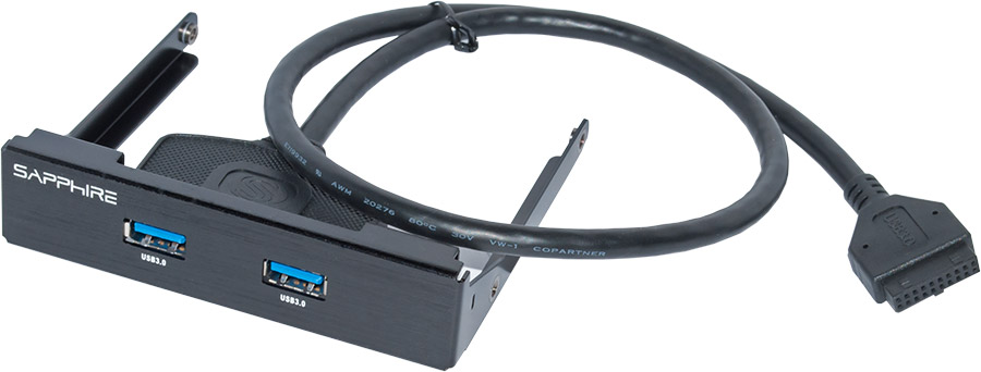 Нечто подобное предлагают многие производители материнских плат, отрадно, что и в Sapphire переняли эту удачную идею. Кстати, при желании шнур с портами USB можно отвинтить от рамки и вывести в один из разъемов расширения на задней стенке корпуса. Удобно.