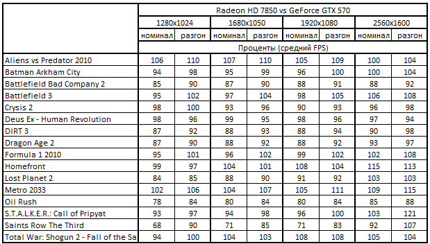 Сводная таблица производительности Radeon HD 7850 2048 Мбайт и GeForce GTX 570 1280 Mбайт, где за 100% взят результат GeForce GTX 570 1280 Mбайт