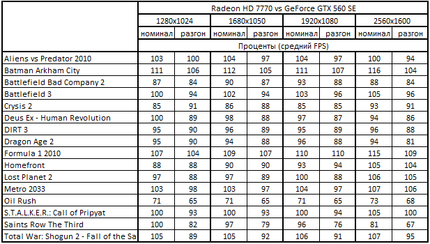 Сводная таблица производительности Radeon HD 7770 1024 Мбайт и GeForce GTX 560 SE 1024 Мбайт, где за 100% взят результат GeForce GTX 560 SE 1024 Мбайт