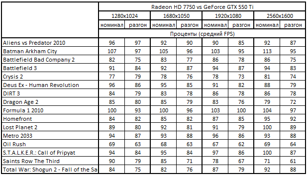 Сводная таблица производительности Radeon HD 7750 1024 Мбайт и GeForce GTX 550 Ti 1024 Мбайт, где за 100% взят результат GeForce GTX 550 Ti 1024 Мбайт