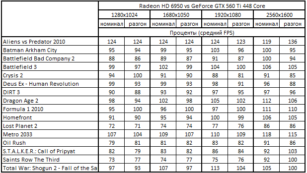 Сводная таблица производительности Radeon HD 6950 2048 Мбайт и GeForce GTX 560 Ti 448 Core 1280 Mбайт, где за 100% взят результат GeForce GTX 560 Ti 448 Core 1280 Mбайт
