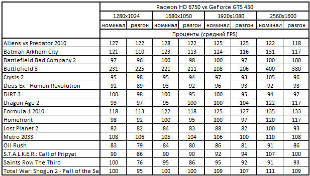 Сводная таблица производительности Radeon HD 6750 1024 Мбайт и GeForce GTS 450 1024 Мбайт, где за 100% взят результат GeForce GTS 450 1024 Мбайт