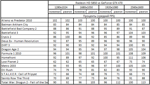Сводная таблица производительности Radeon HD 5850 1024 Мбайт и GeForce GTX 470 1280 Mбайт, где за 100% взят результат GeForce GTX 470 1280 Mбайт