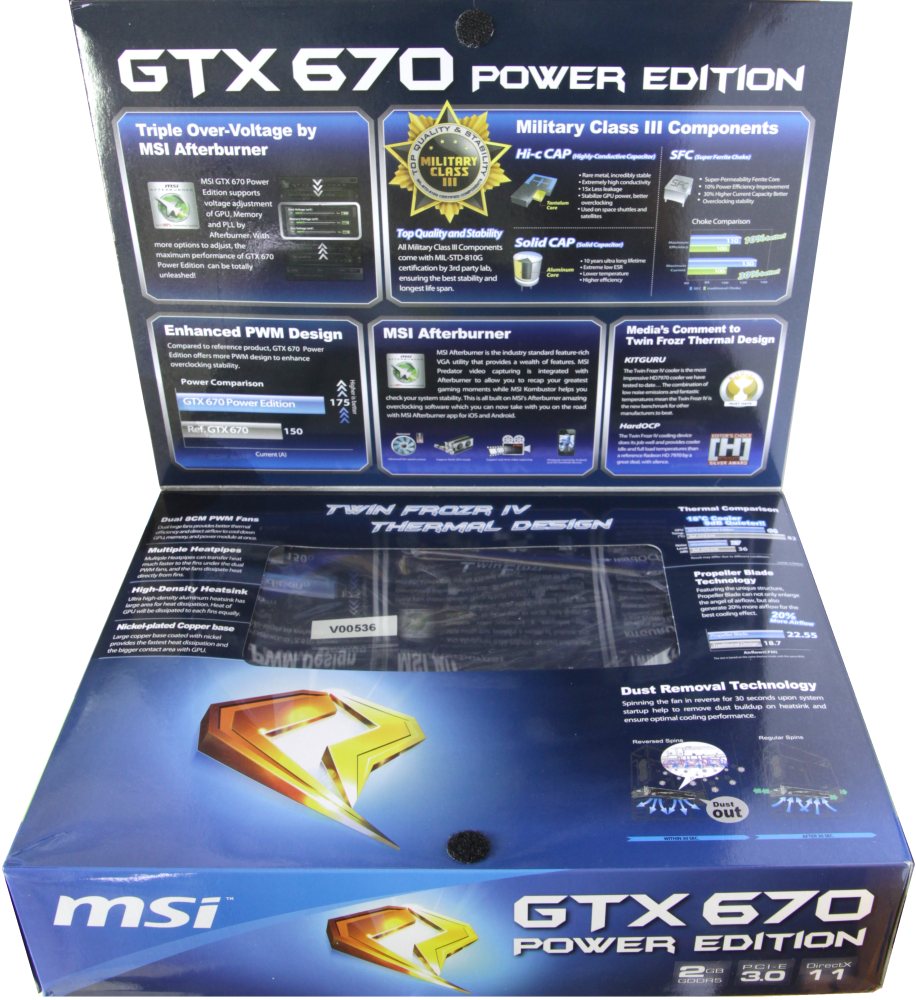 Здесь перед нами самая обычная упаковка. Точно такая же мне встречалась и на предшественнице - MSI GTX 570 PE OC. Картонная коробка без крышки, вместо последней прозрачная пластиковая вставка.