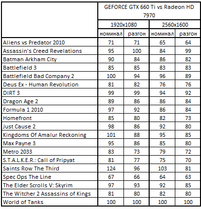 Сводная таблица производительности GeForce GTX 660 Ti 2048 Mбайт и Radeon HD 6970 2048 Мбайт, где за 100% взят результат Radeon HD 6970 2048 Мбайт
