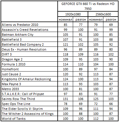 Сводная таблица производительности GeForce GTX 660 Ti 2048 Mбайт и Radeon HD 7950 3072 Мбайт, где за 100% взят результат Radeon HD 7950 3072 Мбайт