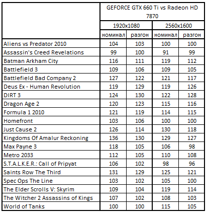 Сводная таблица производительности GeForce GTX 660 Ti 2048 Mбайт и Radeon HD 7870 2048 Мбайт, где за 100% взят результат Radeon HD 7870 2048 Мбайт
