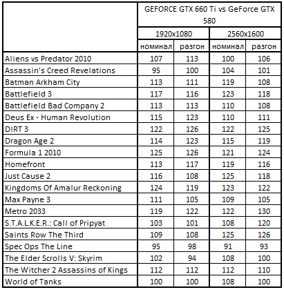 Сводная таблица производительности GeForce GTX 660 Ti 2048 Mбайт и GeForce GTX 580 1536 Mбайт, где за 100% взят результат GeForce GTX 580 1536 Mбайт