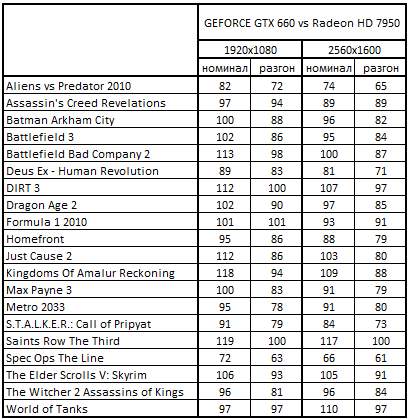Сводная таблица производительности GeForce GTX 660 2048 Mбайт и Radeon HD 7950 3072 Мбайт, где за 100% взят результат Radeon HD 7950 3072 Мбайт