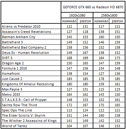 Сводная таблица производительности GeForce GTX 660 2048 Mбайт и Radeon HD 6870 1024 Мбайт, где за 100% взят результат Radeon HD 6870 1024 Мбайт