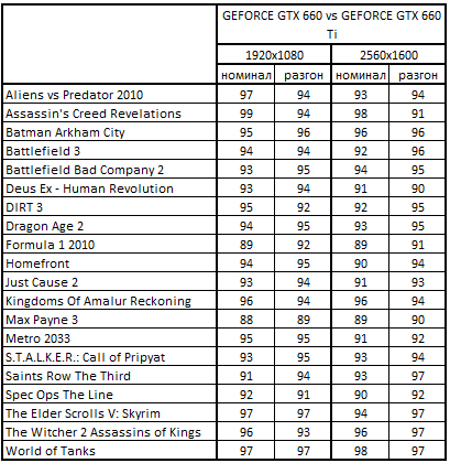 Сводная таблица производительности GeForce GTX 660 2048 Mбайт и GeForce GTX 660 Ti 2048 Mбайт, где за 100% взят результат GeForce GTX 660 Ti 2048 Mбайт