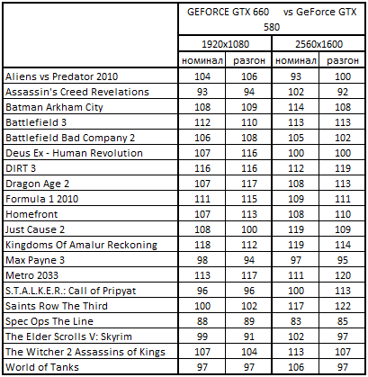 Сводная таблица производительности GeForce GTX 660 2048 Mбайт и GeForce GTX 580 1536 Mбайт, где за 100% взят результат GeForce GTX 580 1536 Mбайт