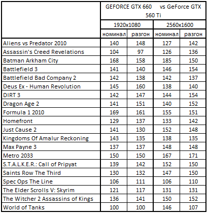 Сводная таблица производительности GeForce GTX 660 2048 Mбайт и GeForce GTX 560 1024 Mбайт, где за 100% взят результат GeForce GTX 560 1024 Mбайт